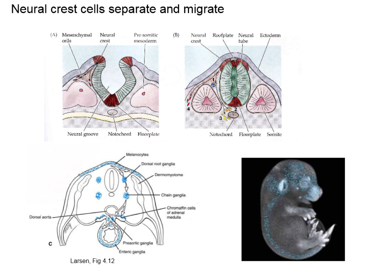 Derivatives – glial cells, melanocytes, gut neurons, retina, dorsal aorta, chain ganglia, head bones, chromaffin cells, pia and arachnoid