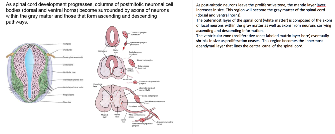 As post-mitotic neurons leave the proliferative zone, the mantle layer layer increases in size. This region will become the gray matter of the spinal cord (dorsal and ventral horns).