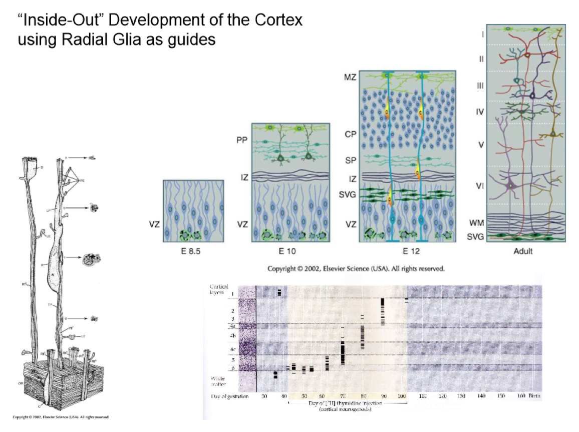 It helps guides newly produced neurons from the ventricular zone to the surface of the cerebral cortex.