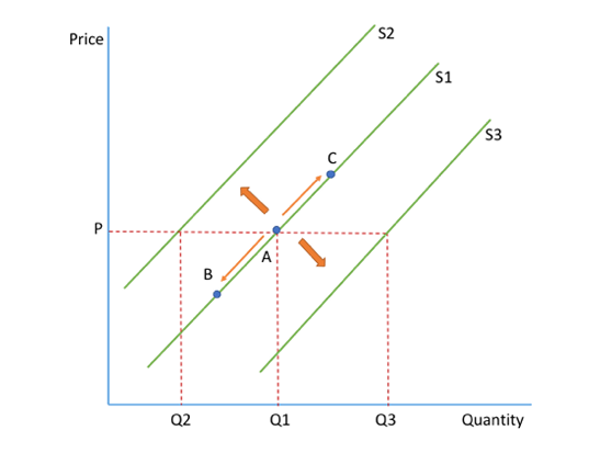 Movement A to B is a contraction in supply quantity of supply falls because of a decrease in price. Movement A to C is extension in supply, quantity supplied rises due to an increase in the price. movements along the curve are called shifts.
