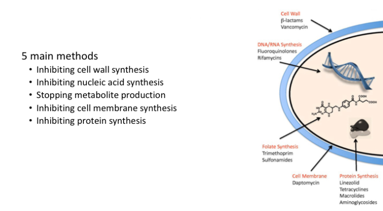 What are the 5 main ways that antibiotics work and give some examples of each?