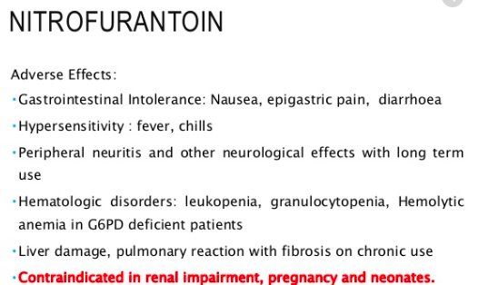 What is the MOA of nitrofurantoin, what are the DDIs and ADRs?