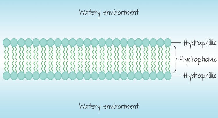 The hydrophilic phosphate heads face the watery environment (cell cytoplasm and extracellular fluid), while the hydrophobic fatty acid chains are sandwiched in between, completely isolated from the water.