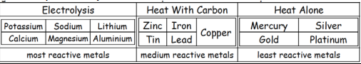 What are the 3 methods of extracting metals and which metals can be extracted by each method?