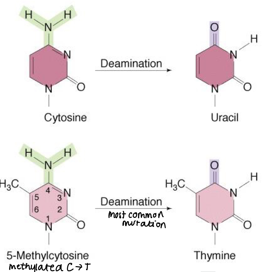 Removal of an amino group from a molecule causing a change in base
