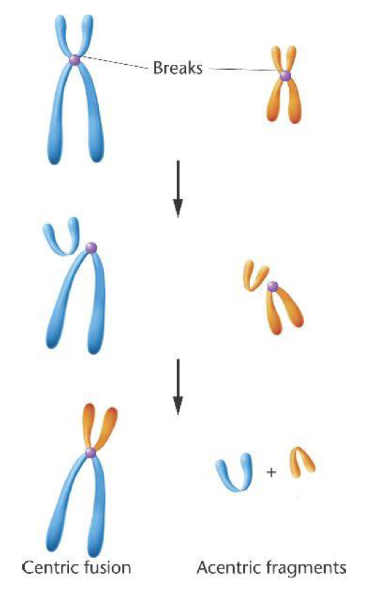 Robertsonian: Breaking at the centromere on two acrocentric chromosomes. Lose the p arms, two q-arms fuse. Individual has 45 chromosomes