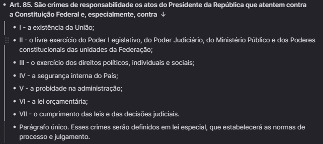 Art. 85. São crimes de responsabilidade os atos do Presidente da República que atentem contra a Constituição Federal e, especialmente, contra: