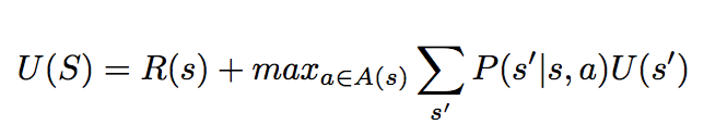 We need to be able to calculate utilities U(s) in order to define optimal policy. Can exploit dependence between states: The utility of a state s is the reward R(s) plus the maximum expected utility of the next state [image].