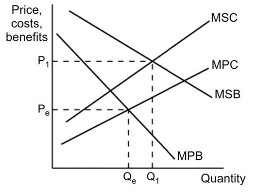 In this diagram, the optimal output level of this good is Q1 and the optimal price is P1 (assuming MPC = MSC). The marginal private benefit is larger than the marginal social benefit.