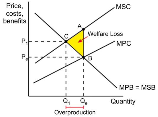 The area between the MSB and MSC is shown by the yellow triangle ABC. This is the area of welfare loss – the loss to society caused by ignoring externalities.