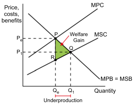 The area between the MSC and MSB is shown by the green triangle PQR. This is the area of potential welfare gain – the gain to society that is lost by ignoring externalities.