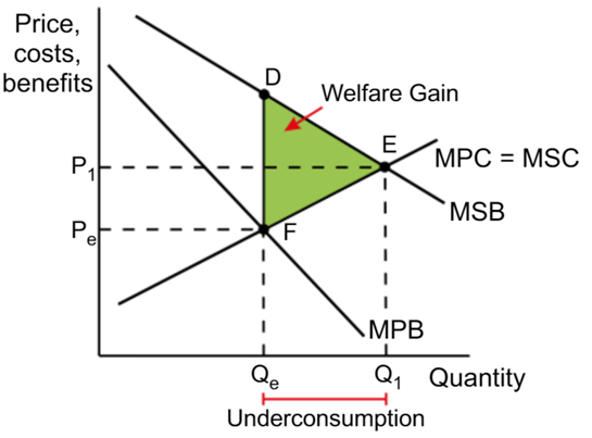 The area between the MSB and MSC is shown by the green triangle DEF. This is the area of potential welfare gain – the gain to society that is lost by ignoring externalities.