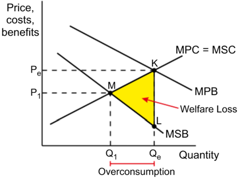 The area between the MSC and MSB is shown by the yellow triangle KLM. This is the area of welfare loss – the loss to society caused by ignoring externalities.