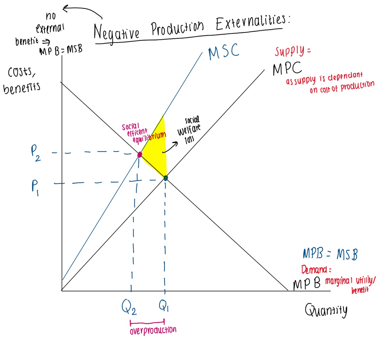 Draw a negative production externality/ external costs of production diagram