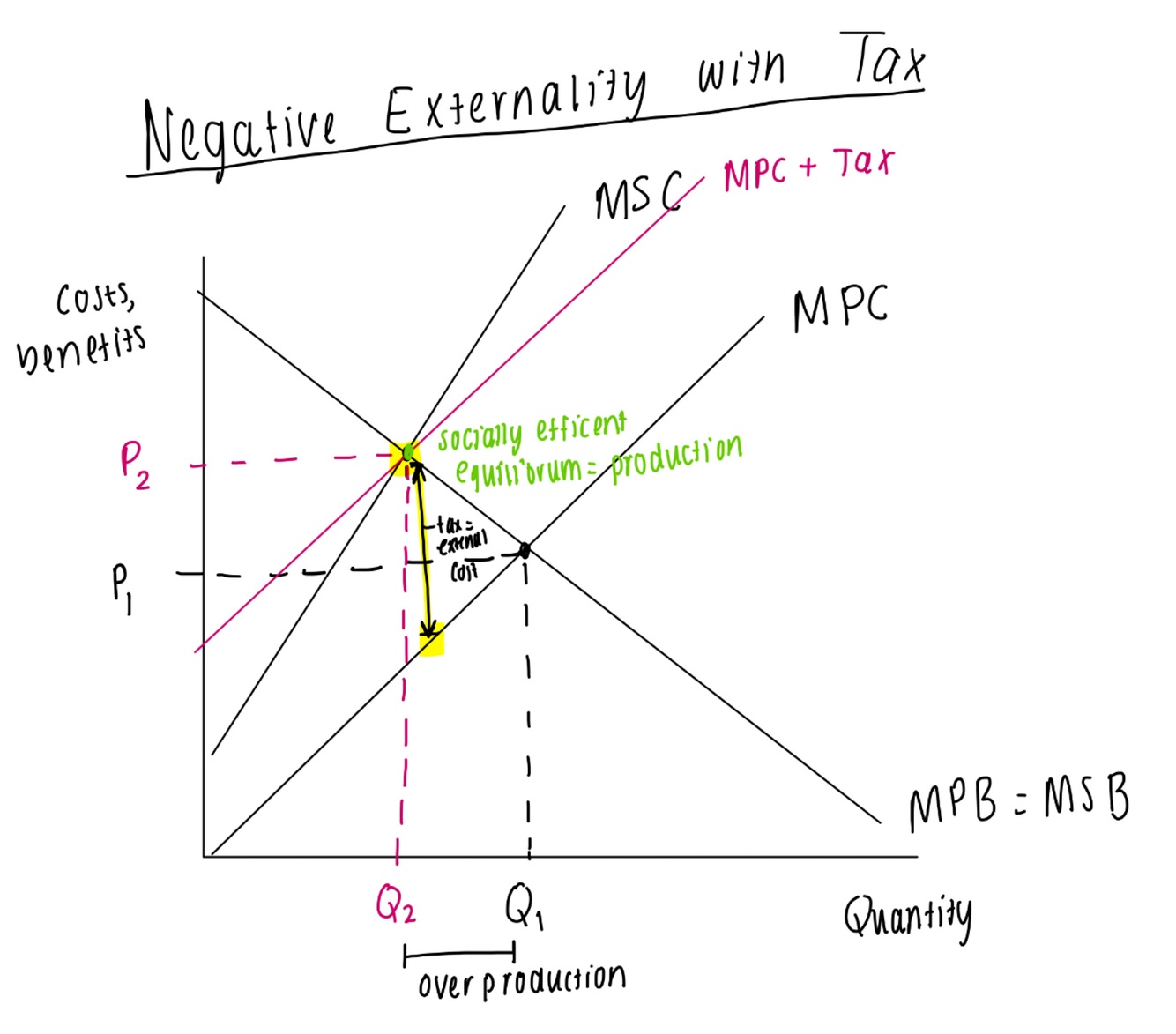 draw a negative production externality with tax diagram