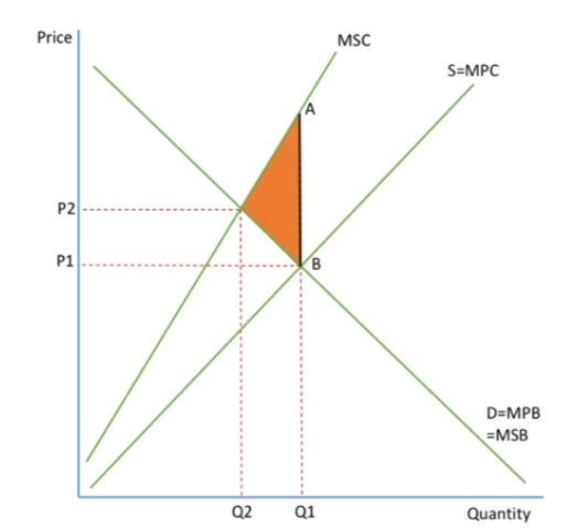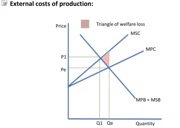 The market left to operate freely will ignore the external costs involved in producing a good. It will produce where MPB=MPC, the market equilibrium, at Q1P1.