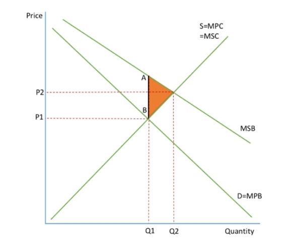 In the diagram, the market left to its own devices will produce where MPB=MPC, it will