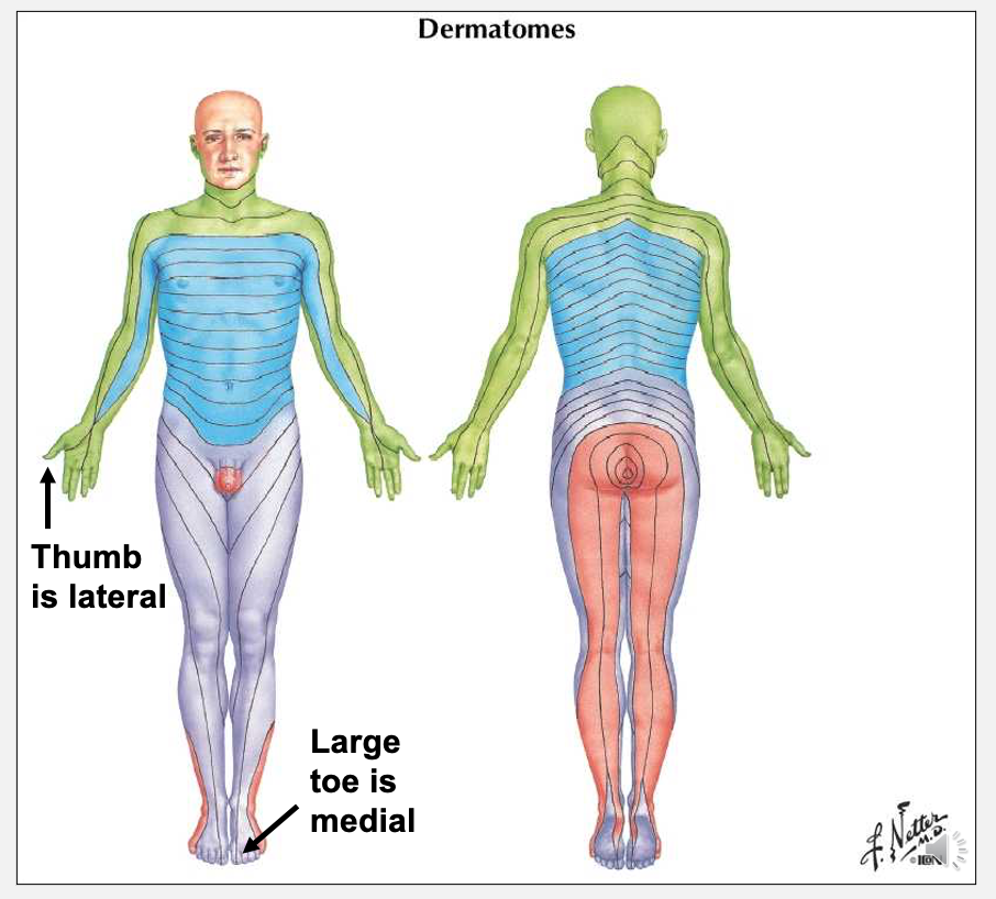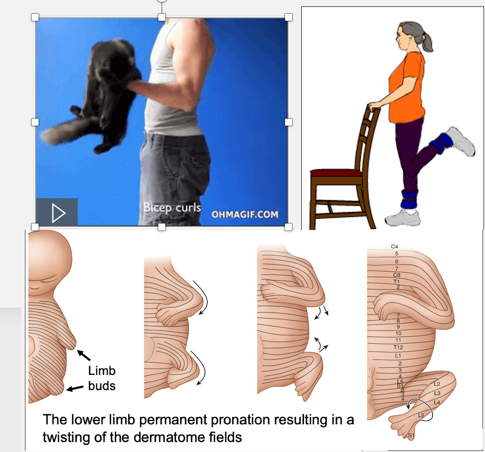 anterior position → dermatomes of the LL have twisted and oblique fields, compare to UL which are much straighter