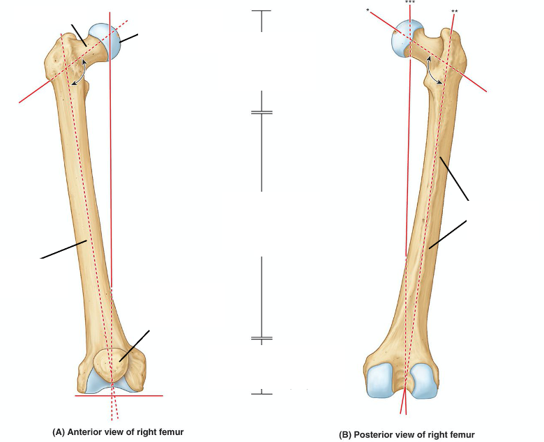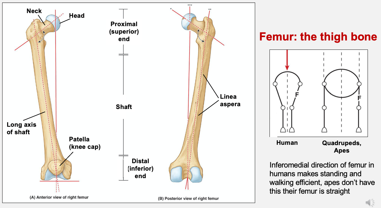 head and neck of femur is oblique, distal end is on a horizontal plane → makes thighs inferomedially oblique → makes knees close together and under pelvis → important for bipedal gait