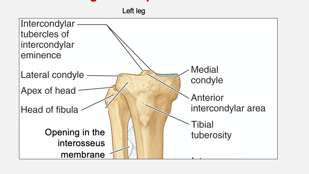 tibial plateau is divided into 3 parts → medial condyle, lateral condyle, intercondylar eminence which has pair of intercondylar tubercles