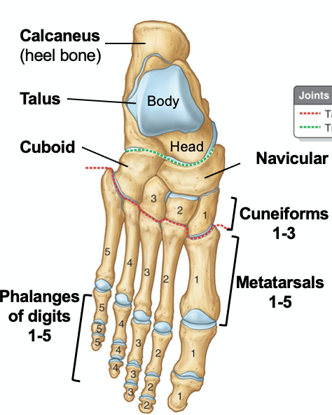 foot = tarsals, metatarsals, phalanges