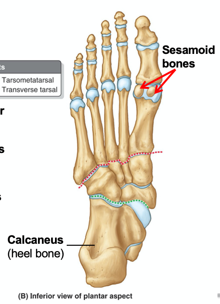 sesamoid bones - pair of small bones seen in the 1st metatarsal phalangeal joint which are embedded in tendon of flexor hallucis brevis