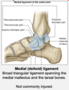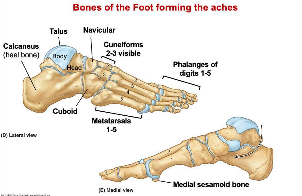 medial - calcaneus, talus, navicular, 3 cuneiforms, 1st 2nd 3rd metatarsals