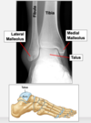 talus (sits on top of calcaneus) articulates with medial and lateral malleolus of leg bones to form ankle joint