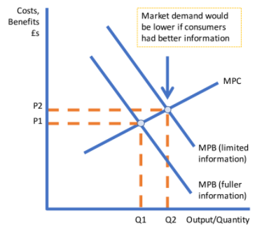 If they had fuller/better information on the benefits to themselves of consuming a good or service, the marginal private benefit curve would shift lower leading to a smaller equalibrium (Q2 to Q1)