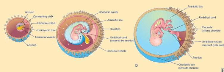 - Chorionic sac and amniotic sac separate but then as the amniotic sac enlarges it displaces the chorion and fuses with the chorionic membrane