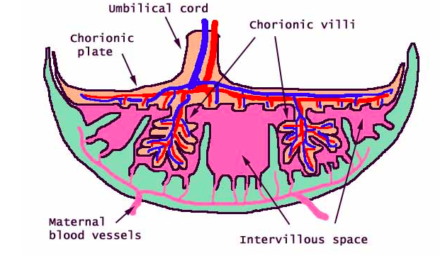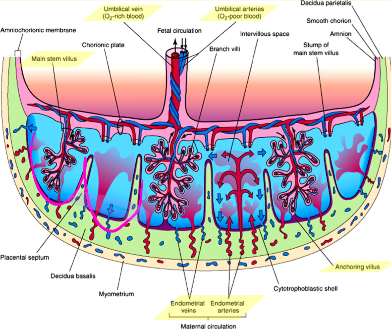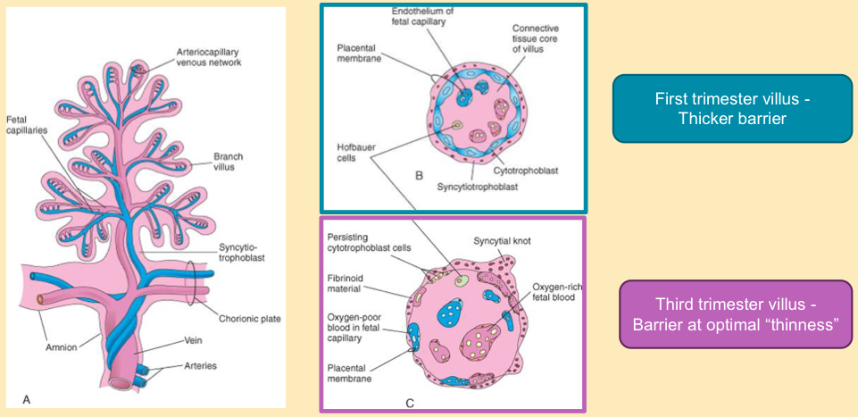 1st trimester: barrier between maternal and fetal blood vessels thick. Full layers of cytotrophoblasts and syncytiotrophoblasts