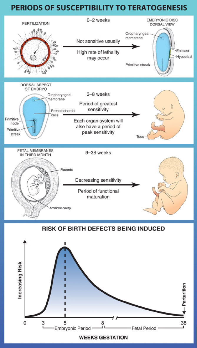 - Embryonic (3-6 weeks): sensitive as body systems developing