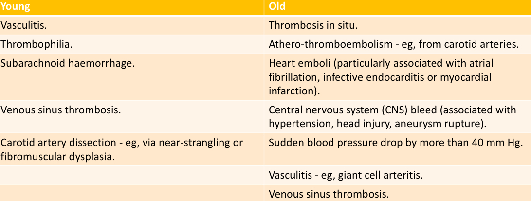 - Other (5%): dissection, venous sinus thrombosis (occlusion of veins causes backpressure and ischaemia due to reduced blood flow), hypoxic brain injury (e.g after MI)