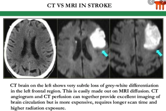 MRI: rarely done due to takes a long time, ischaemia shows up as high energy signal