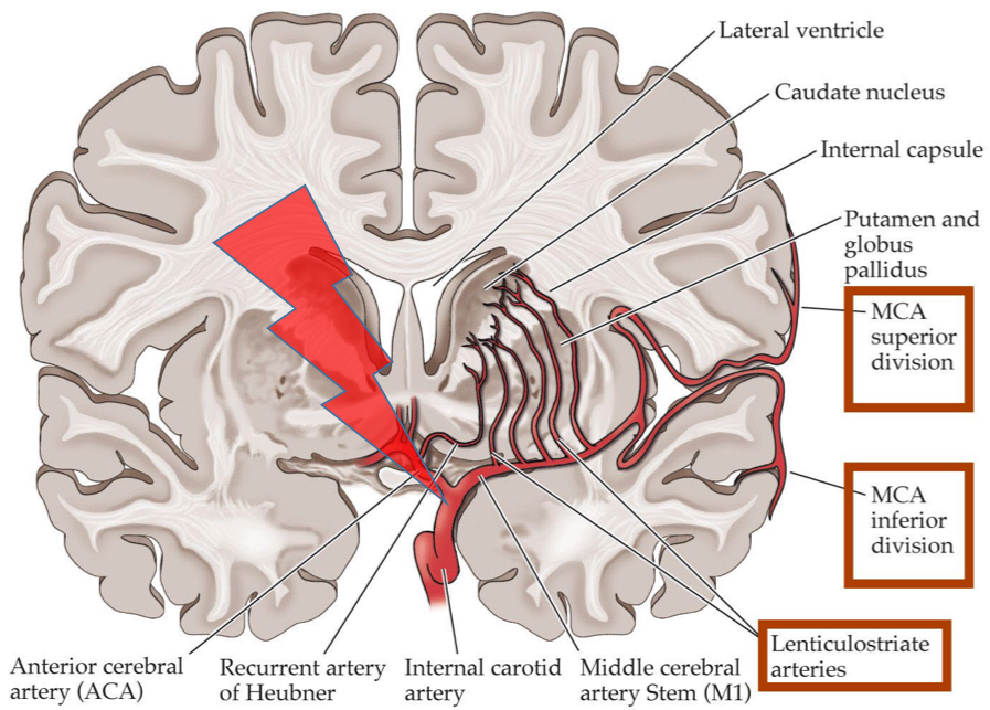 Lacunar strokes: Destruction of small areas of internal capsule and basal ganglia