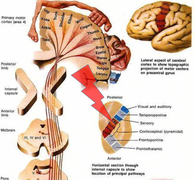 - Contralateral sensory loss (mainly face and arm due to homunculus but larger areas if internal capsule involved)