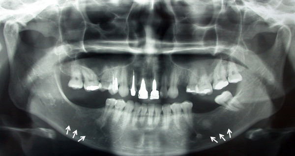 Osteopetrosis caused his bone to necrose, leading to these fistulous tracts.
