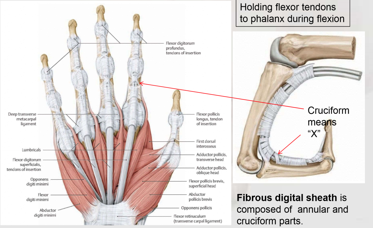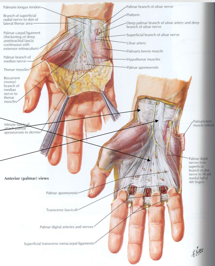 Lies deep to the palmar aponeurosis and palmaris longus tendon. It is also part of the palmar fascia.