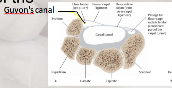 Where are the carpal tunnel and Guyon’s canal in relation to one another?