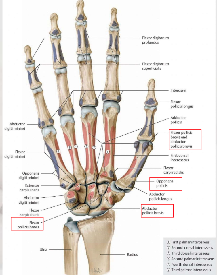 Abductor pollicis brevis, flexor pollicis brevis, opponens pollicis