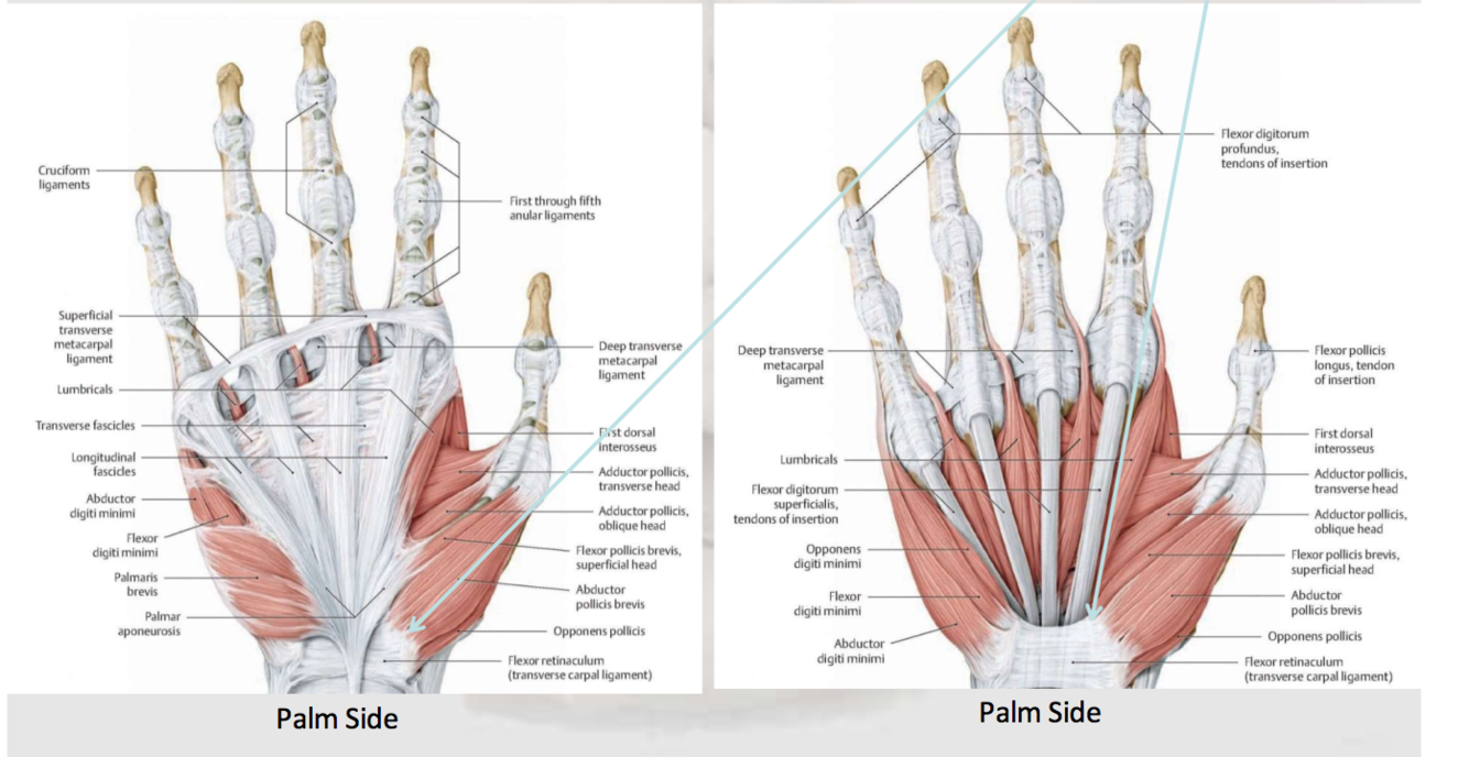 What is blended by the palmar aponeurosis? (Hint: a tendon and ligament)