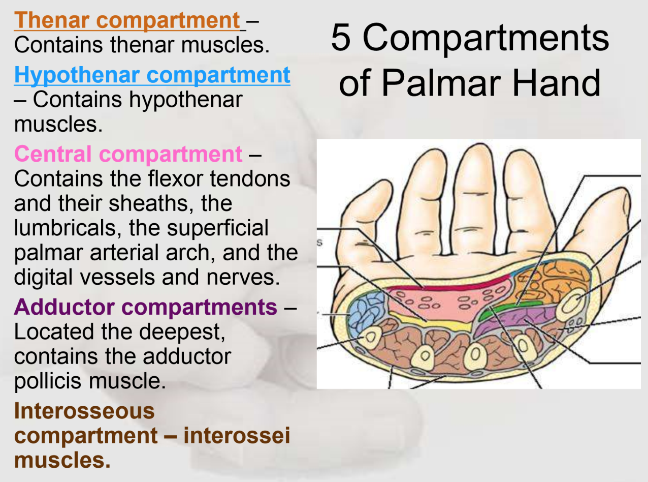 What are the five compartments of the hand and their location?