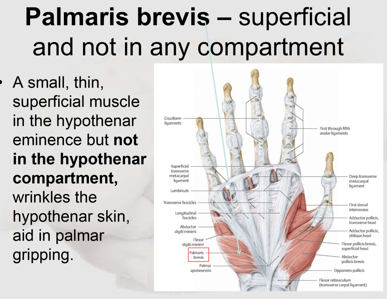 Lies deep to the palmar aponeurosis and palmaris longus tendon. It is also part of the palmar fascia.