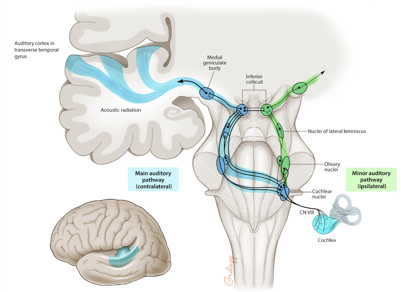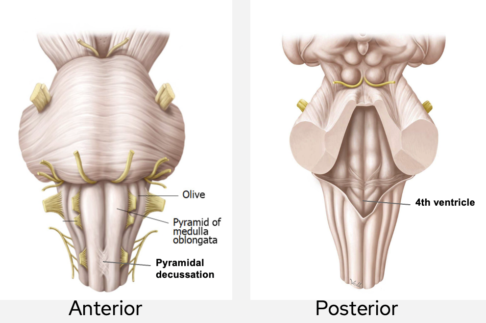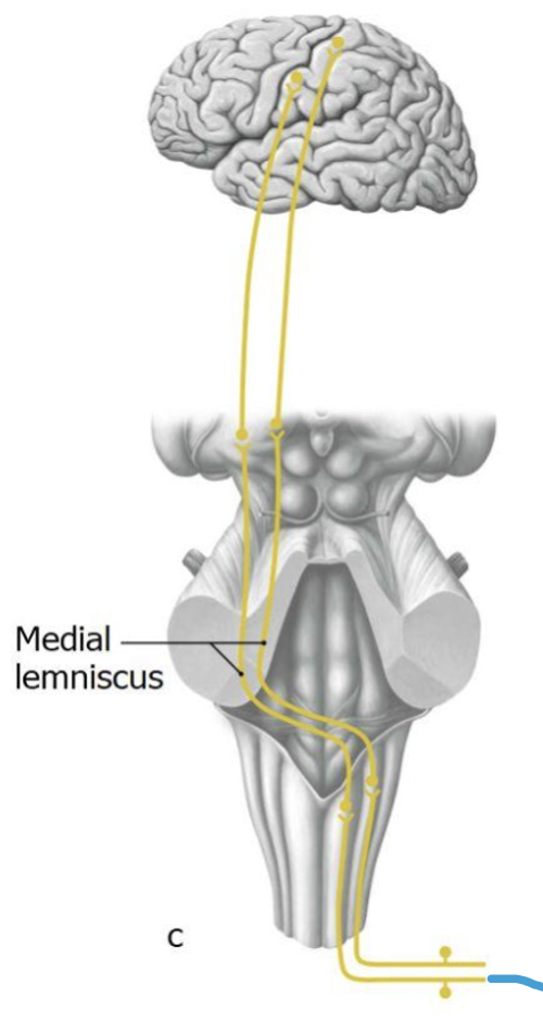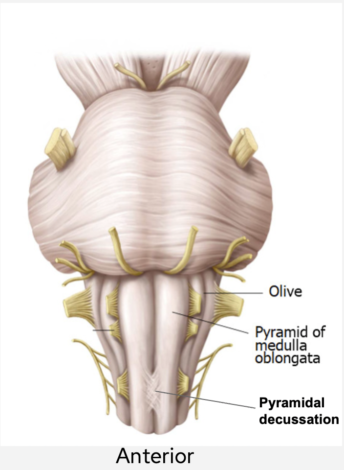 Sensory fibers cross rostral to the pyramidal decussation. They form a tract called the medial lemniscus traveling to the sensory cortices