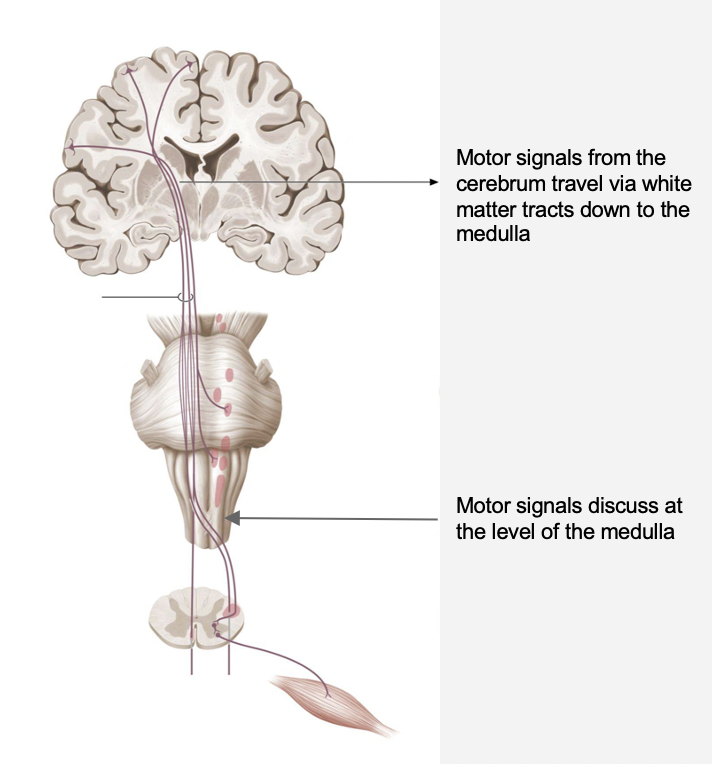 Motor nerves from the cortex travel to the pyramids and cross at the distal medulla