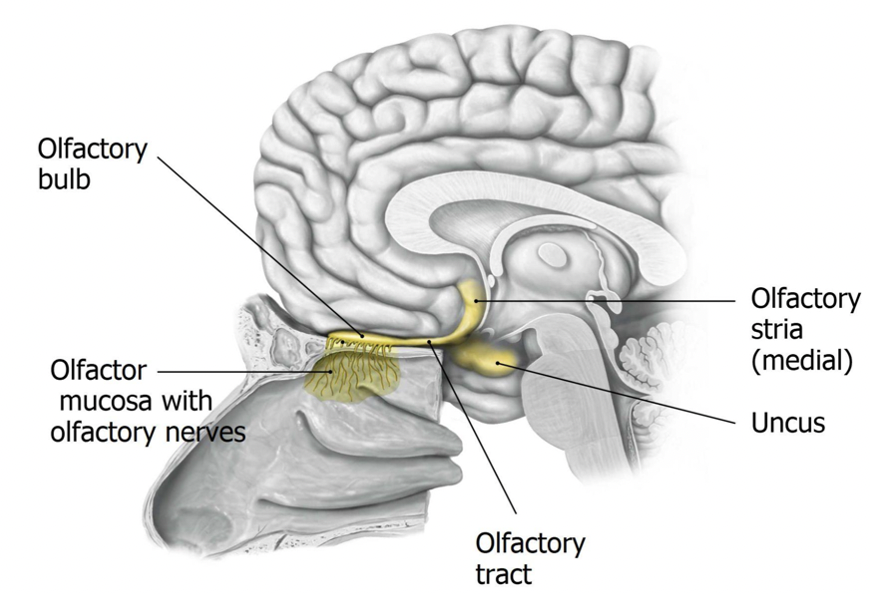 The olfactory signal travels from the olfactory bulb, along the olfactory tract, to several areas on the ventral surface of the brain.