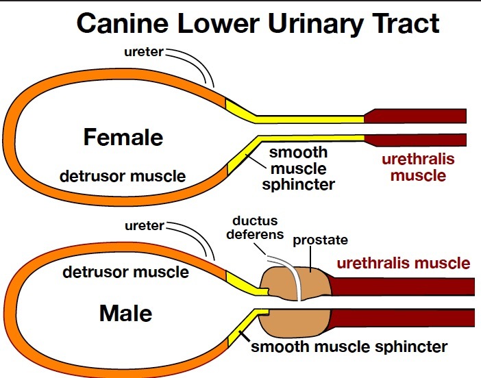 (Note: in quadrupeds, passive resistance is augmented when urine weight pulls the bladder cranially into the abdomen away from the urethra (Squatting to urinate shifts urine weight caudally against the urethral opening)
