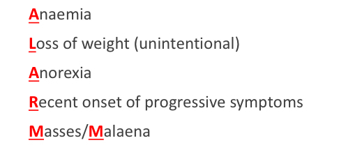 What are some red flags that can occur with epigastric pain that point towards a stomach malignancy?