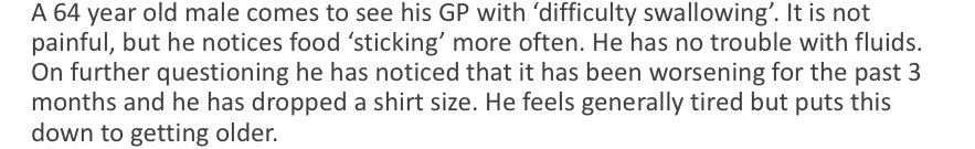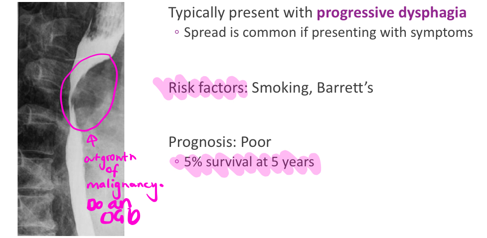 What is a common presentation of oesophageal cancer and what are some red flags along with this presentation?