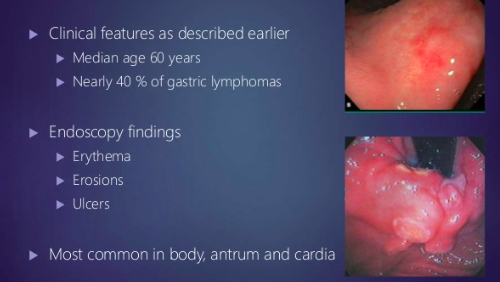- Gastric lymphoma: MALT tissue, associated with H Pylori and has better prognosis. Most common primary site for gastrointestinal lymphoma